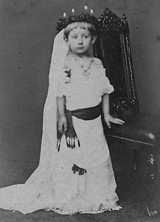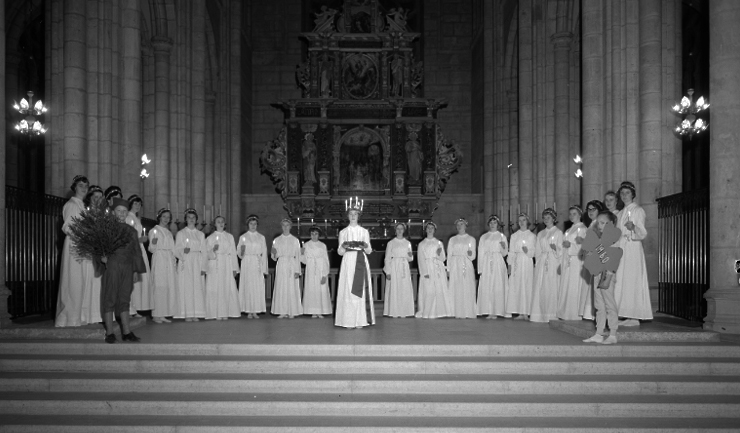 Men kommer det sig att en siciliansk martyr från 300-talet tog form av en vitklädd ljusgestalt hos oss? Om det vet vi inte så mycket. Men vi känner till att Lucia var känd under medeltiden här i Norden. En del forskare menar att Lucias förebild ska hämtas från Tyskland, där ett Jesusbarn klädd i vit särk – Kinken Jes eller Christkindl – delar ut gåvor till jul. Kanske är det Christkindl som fotografen såg framför sig då han omkring 1880 tog bilden ovan på den lille Hjalmar Carlander som Lucia?