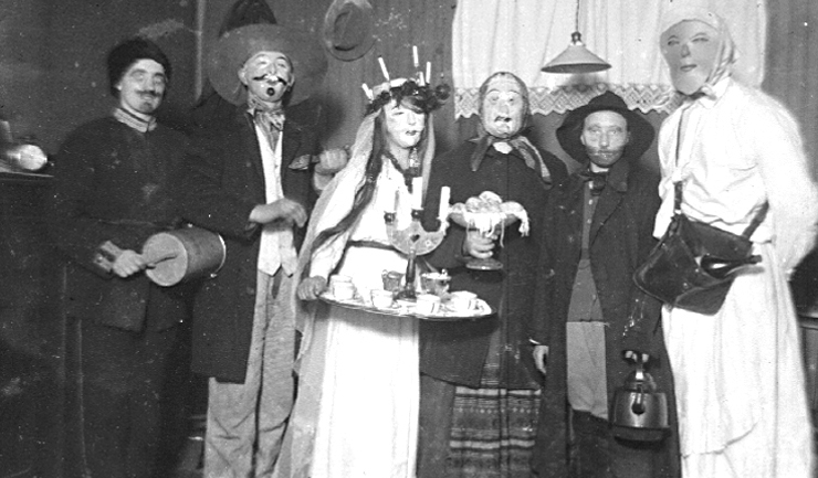 Men låt oss inte heller glömma det mer folkliga lussefirandet, ett firande som trängts ut av det seriösa luciatåget! På kvällen den 12 december drog några märkliga figurer genom byn. Det var karlar med skägg av blånor, klädda i avigt vrängda pälsar, försedda med käpp och pipor. Märkligt ljusa röster hade de! I sällskapet fanns sjalettklädda fruntimmer med grova röster. Ansiktena var svärtade av kol, några bar hemska masker av näver eller papper. Det gick livligt till. Skratt, sång, fiol och dragspel hördes där det utklädda följet drog fram. Lussegubbar kallades de, varje gård gästades och överallt tiggde de utklädda en slant eller en matbit till ungdomskalaset. Här nedan finns även ett foto på lussegubbar i Broddetorp 1918.