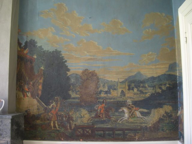 En intressant liten detalj är att panelen till vänster om öppna spisen sitter i orätt ordning, den skall sitta mellan turneringen och bröllops-processionen. Men där kommer en dörr, kanske tyckte man att den var för fin för att bara försvinna i intet!