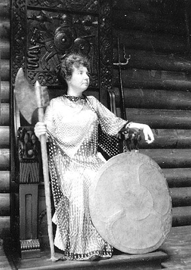 Möblerna var inspirerade av den ”fornnordiska drakstilen”, en av sena 1800-talets många modestilar. Ek var det självklara trämaterialet, dekorationen bestod av drakslingor och drakhuvuden. Mönstren var ofta geometriska i plattskärning. Självklart hörde ett högsäte hemma i en fornnordisk matsal. På fotografiet ovan avbildas Agnes som en valkyria utrustad med hillebard och sköld!
