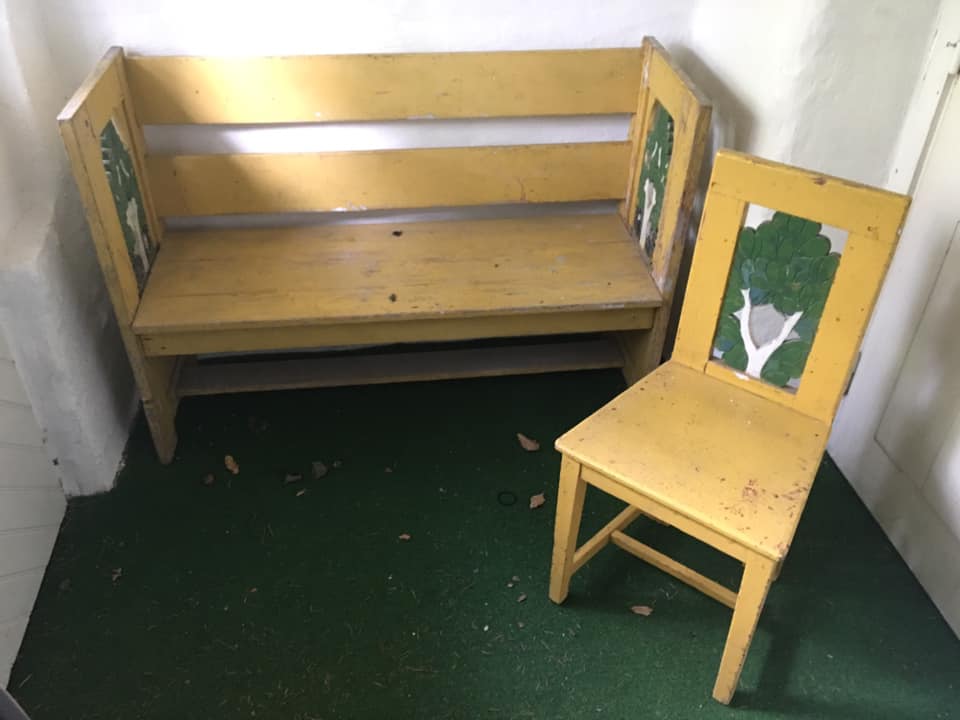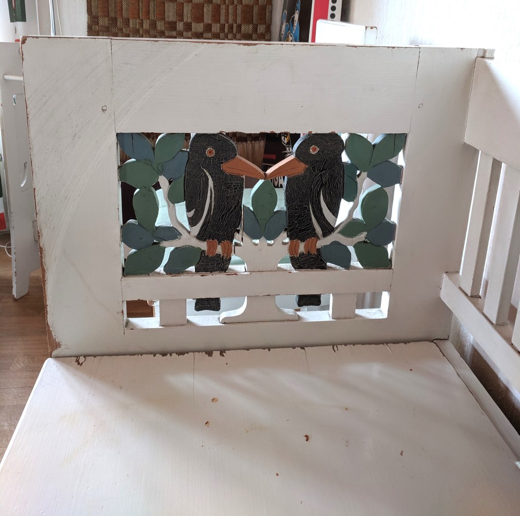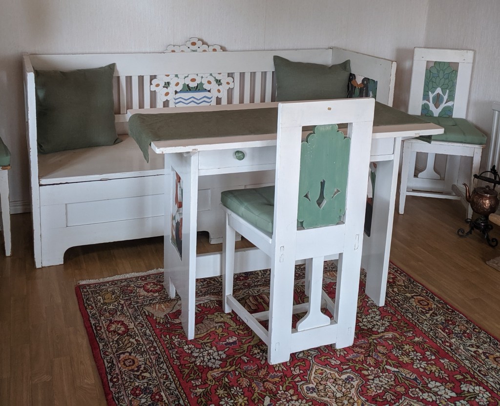 Nå, i alla fall så såldes Carl Westmans barnkammarmöbel på auktion då Vättersro lades ner i slutet på 1970-talet. Soffan, bordet, stolarna och en handdukshängare är återfunna, men vart tog skåpet och vägghyllan vägen? Och karmstolen som skymtar bakom soffan? Den är förmodligen också ett verk av Westman.
