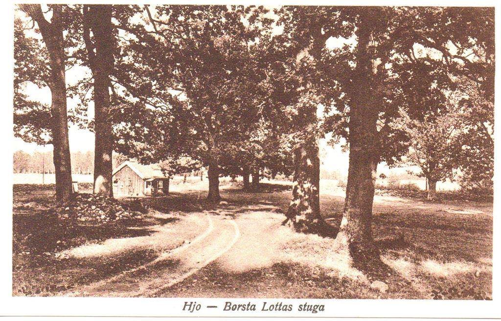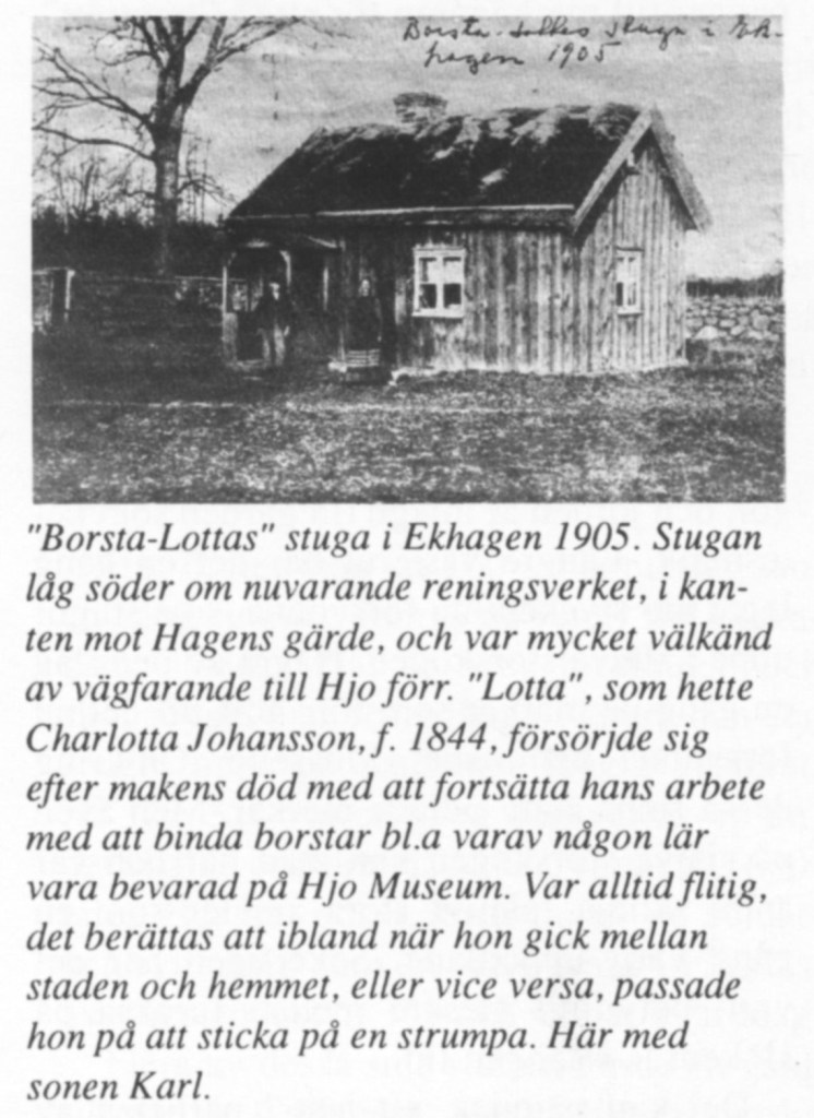 Om”Borsta-Lotta” berättade min pappa att hon för att ”badgästerna” från vattenkuranstalten skulle tycka lite synd om henne, och köpa en borste, ska ha sagt att hon hade varit tvungen att gå genom tre socknar för att komma till marknaden. Detta var sant. Hon bodde några meter innanför gränsen till Norra Fågelås socken. Stugan låg ett tiotal meter från landsvägen mot Hjo. Hjo landsförsamling tar vid direkt vid muren som syns bakom stugan på bilden och sträcker sig ca 200 meter norrut längs vägen, därefter börjar Hjo stadsförsamling. Hennes gångväg till torget var ca. 2 km.