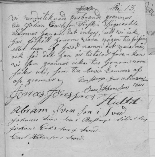 Bilden visar ett intyg som finns i häradsrättens handlingar där – som en motvikt till alla rykten om Carl Johans skuld ¬ ett antal män som kände honom betygar att de inte kan tro att han mördat Johanna.