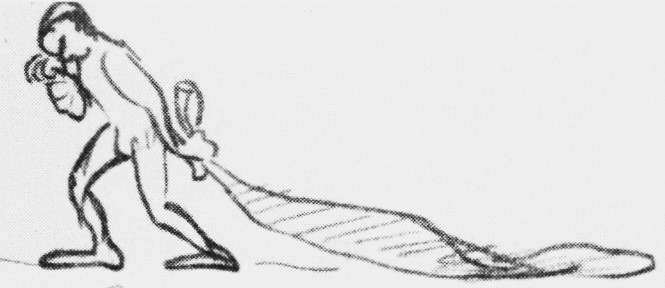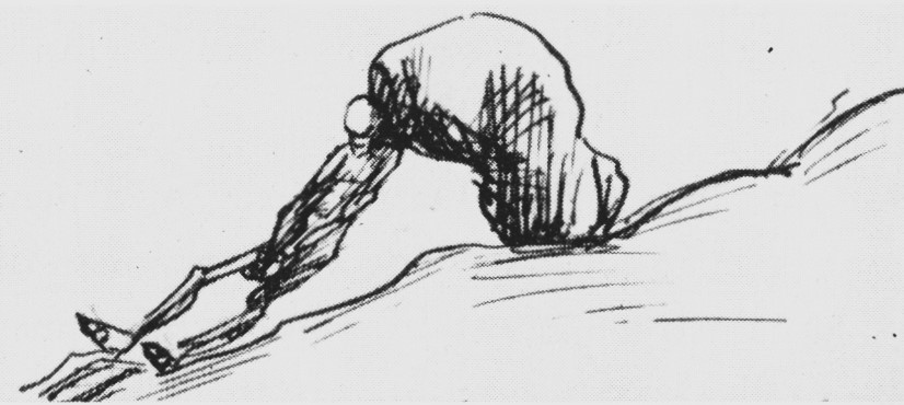 I dess små, små teckningar rämnar Harriets fasad av ironi och putslustigheter och hon släpper in oss i ett inre rum befolkat av nakna människofigurer fjättrade i bojor, bedjande på knä, gående med snuttefilten släpande efter sig eller liggande med den egna kroppen som bro över ett stup. En hopkrupen figur sneglar mot fyra, skuttande, livsglada streckfigurer. En figur baxar en stor sten uppför ett motlut. En annan sträcker bedjande ut handen efter månens skära.