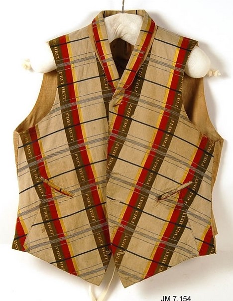 En mansväst i Jönköpings läns museums textilmagasin väcker nyfikenhet. Dess snitt är från 1800-talets första hälft. I det rutiga mönstret ingår ränder i mossgrönt, rött och gult. Invävt i den gröna randen återkommer ordet Freiheit (Frihet). Vid närmare studier kan man ana att den gröna färgen ursprungligen varit svart. Svart – rött – gult var de tyska färgerna.
