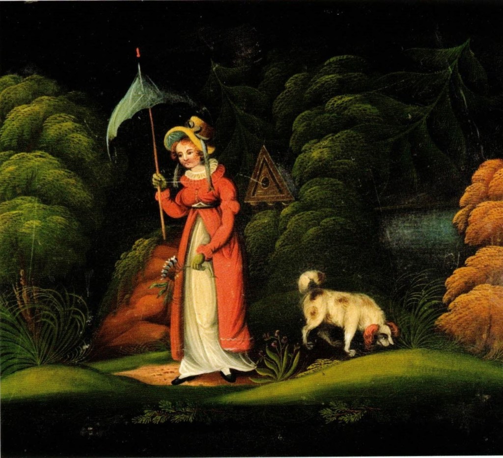 En kvinna med parasoll till skydd mot solen i ett parkliknande landskap. I bakgrunden en sjö, är det ett tempel som skymtar i grönskan? Hunden tycks vara på väg att följa ett eget spår in bland träden. Motivet finns på en lackerad plåtbricka som Västergötlands museum 1910 köpte av fabrikör Ahlström.