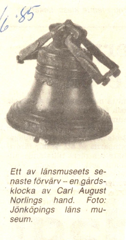 Den här texten skrevs i samband med att Jönköpings läns museum förvärvat en gårdsklocka med följande ingjutna upplysning: