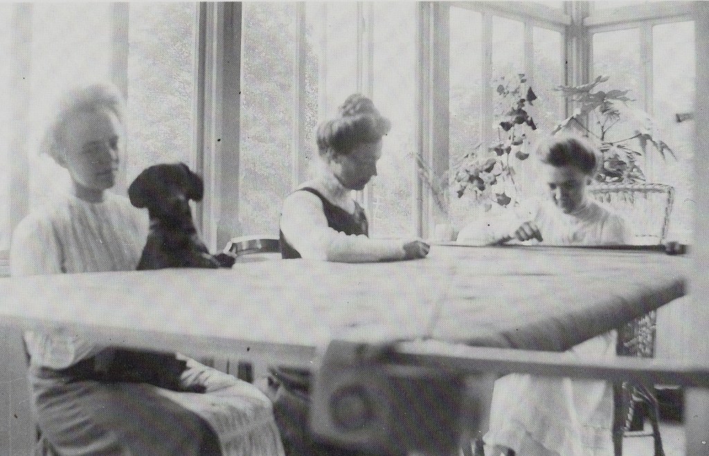 Vi betraktar ett fotografi från ett hem i sekelskiftets Jönköping. Sommarens dofter letar sig igenom det öppna verandafönstret och vi kan ana att de tre kvinnorna kring täckbågen böjer sig över arbetet med låtsat allvar.