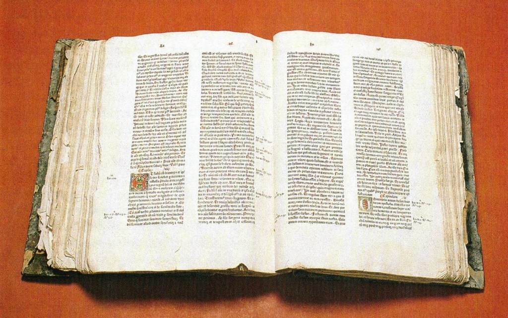 Gutenbergs förebilder var naturligtvis de handskrivna bokstäverna. Hans textstil ansluter därför till handskriften och som ett arv från handskrifterna levde länge de många förkortningarna kvar. Initialer målades ofta för hand. 1483 trycktes den första boken i Sverige, ett missale för ärkestiftet. Men eftersom vi inte hade någon inhemsk papperstillverkning och de tyska invandrade boktryckarna var få, kunde det hända att böcker för svenska behov trycktes utomlands eller att böcker importerades, precis som den tyska bibeln som hamnade i Jönköping.