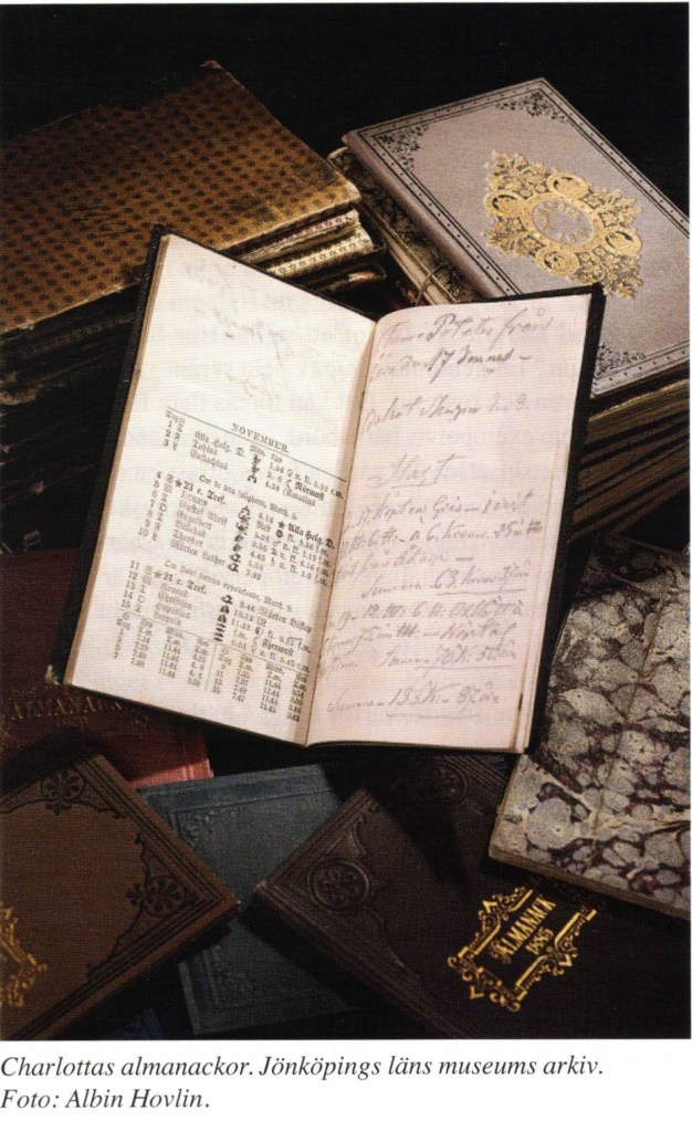 Men i juni, direkt efter bröllopet, handlar anteckningarna om inköp av smör, om brödbak och tillverkning av svagdricka. Snabbt går Charlotta in i en yrkesroll, nämligen den som hushållare på en större gård med allt vad det innebär av arbetsledning, planering och praktisk hushållskunskap. Sina sysslor som hushållare antecknar hon under hela livet i almanackor som bands samman med två anteckningsblad per månad. Totalt finns 53 almanackor bevarade för eftervärlden.