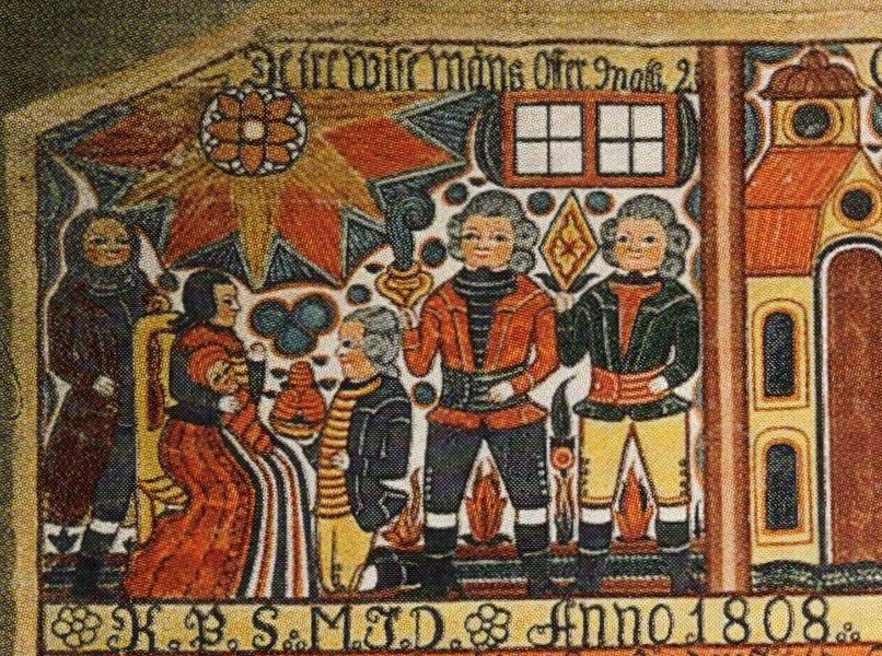 Scenen som föreställer jungfru Maria och de tre vise männens uppvaktning finns på en gammal textil bonad. För länge sedan sattes den upp i en smålandsstuga inför varje julhelg. Till vardags saknade stugans väggar tavlor och andra prydnader. För vem skulle ha kunnat se dem i den vanligen så mörka och skumma stugan, där sot, damm och spindelväv täckte de nakna timmerväggarna?