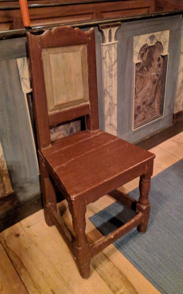 Det finns också några stolar i kyrkan skänkta av Anna Hierta 1709. Här en bild på en av dem.