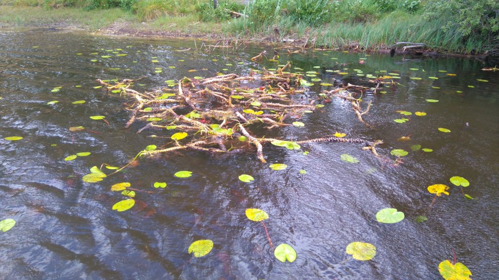 Även näckrosrötter kunde tas tillvara. Men då roten är giftig, måste den torkas och malas. Därefter slammades mjölet flera gånger i hett vatten. Här ett fotografi från i fjol på kraftiga näckrosrötter i Bastugölen.