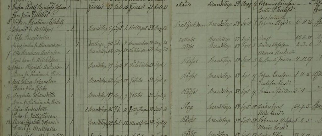 Den 30 augusti 1854 dör den treårige Otto Herman Andersson från Nätebäcken. Den 1 september Johan Reinhold Andersson, född 1849, den 9:onde Carl Johan Johansson i Fotebo, endast tre år gammal. Dödsorsaken är rödsot. Och så fortsätter det hela hösten, 20 brandstorpsbor faller offer för sjukdomen, de flesta barn. Året därpå avlider nio barn i sjukdomen som liksom året innan dyker upp i slutet av augusti. 1856 är dödstalen normala igen, för att för åter stiga 1857.