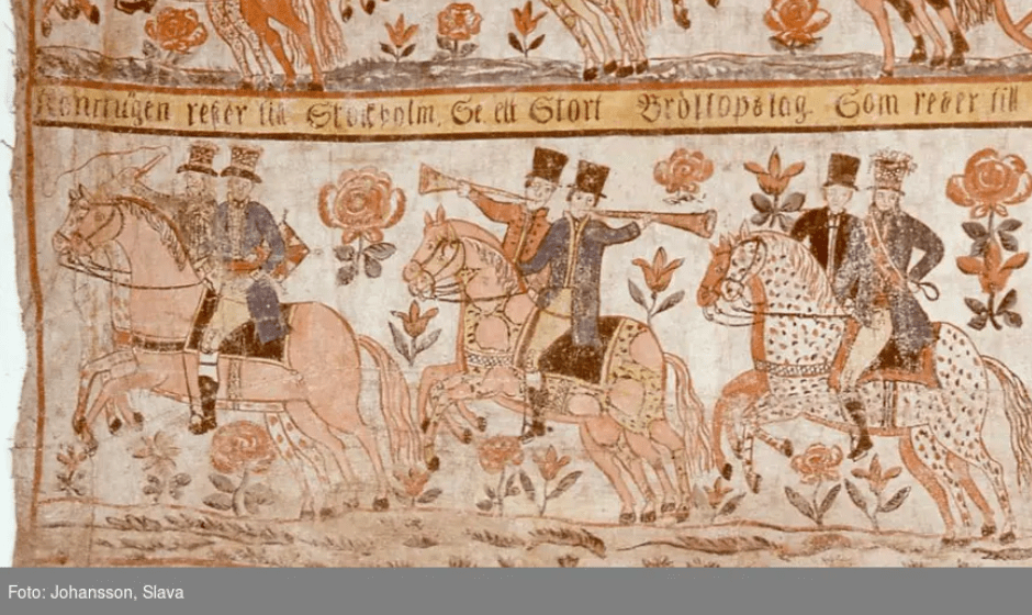 Hur det hela kunde te sig, kan vi idag studera på en bonadsmålning i Nordiska museet. Under armen på den främste ryttaren anas hyendet: en kudde i lappteknik med tofsar i hörnen.