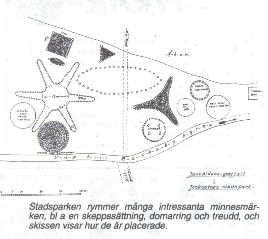 Ingenjör Friberg var pedagog, men också en entusiastisk arkeolog. Och bland hans projekt fanns också ett järnåldersgravfält i parken. Hans avsikt var att flytta originalen, men det tycks ha stött på motstånd bland ortsbefolkningen. I stället kom att uppföras rekonstruktioner av fornlämningar. Idag kan man bland högt gräs och buskar (eller i snön) ana bl a en skeppssättning, någon domarring och en treudd. Enligt Fribergs anteckningar i länsmuseets arkiv är t ex skeppssättningen en kopia av en dito i Berga socken.