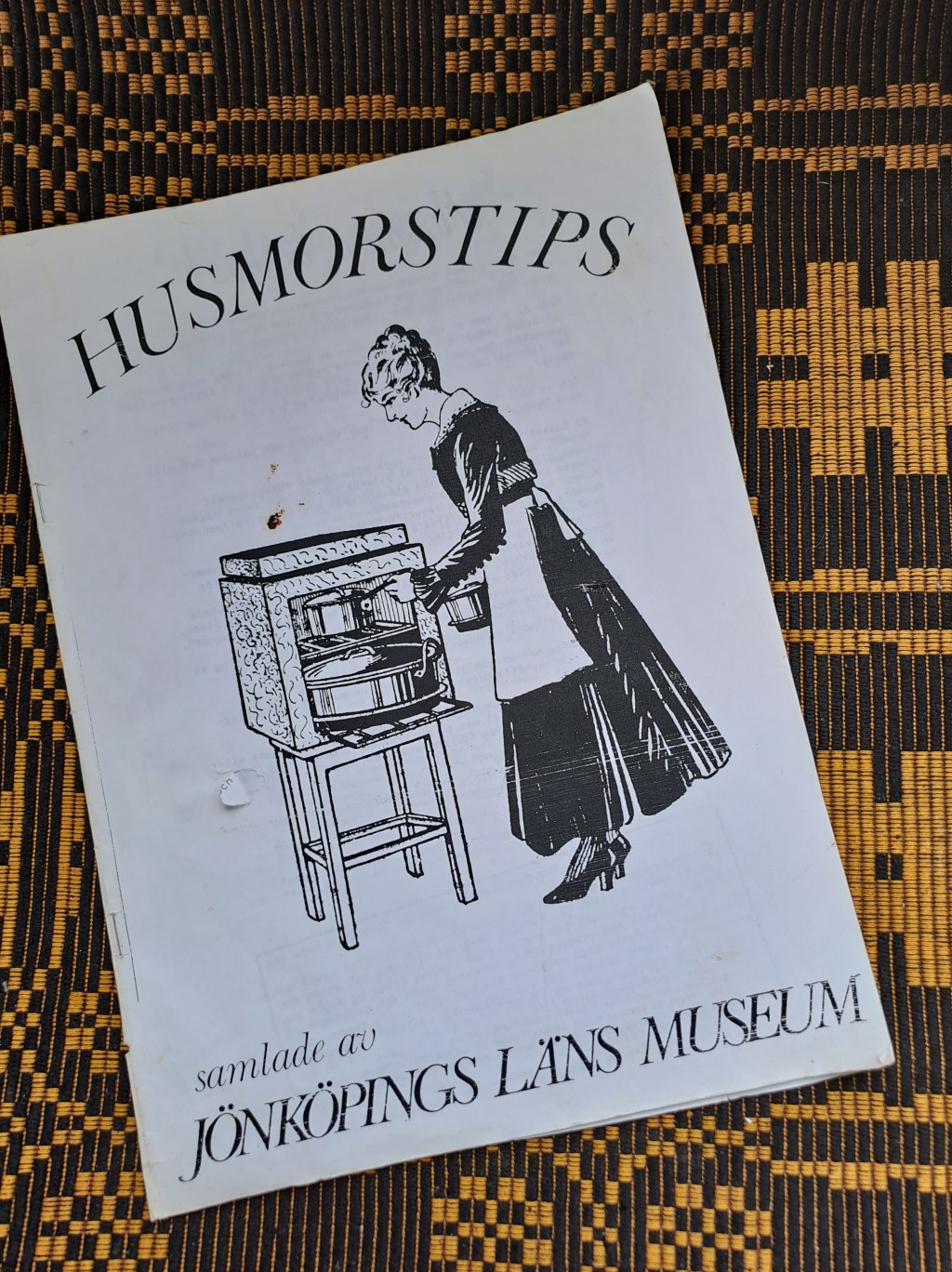 Vad bra, tänker jag ännu inte uppstigen, att museet redan börjat det där arbetet. I en liten folder, som heter Husmorstips, har museet samlat råd och tips ur äldre hushållsböcker i museets arkiv. Bara nu Henry hunnit trycka upp tillräckligt många foldrar, tänker jag, gäspar och vaknar på riktigt.